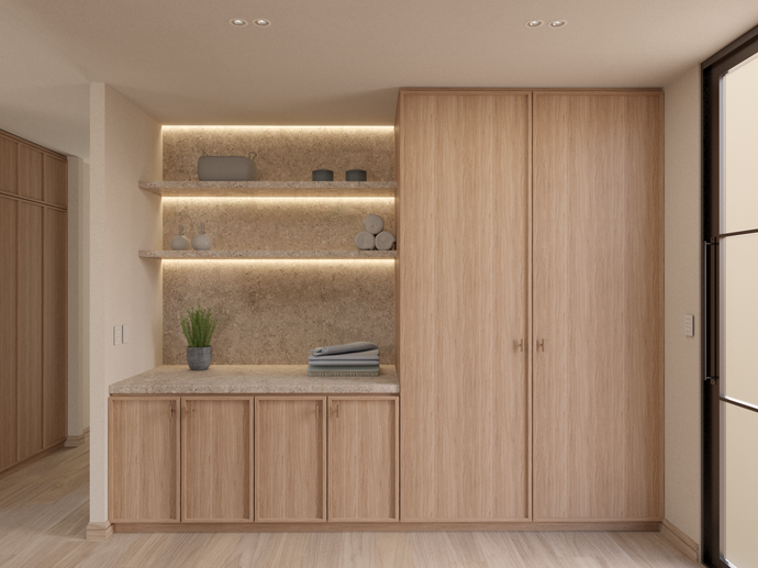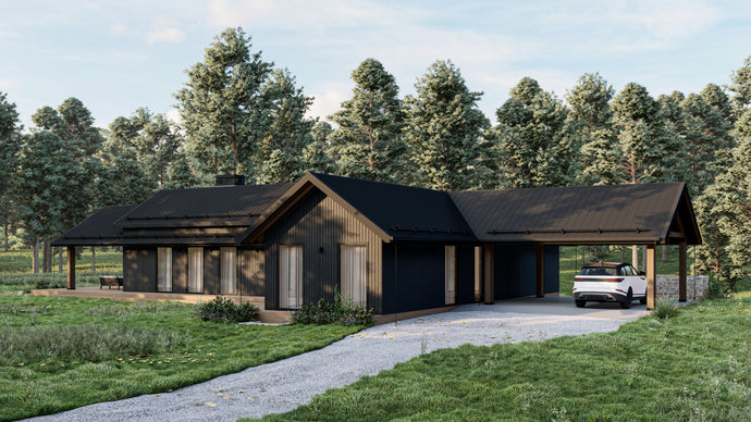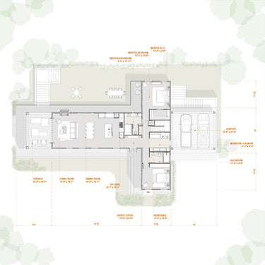 A mudroom and laundry area connect the two-car carport to the rear entry, supporting a practical and organized daily routine.