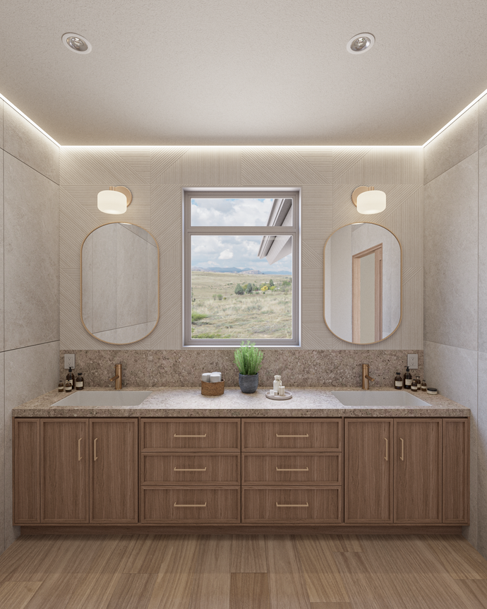 The master bathroom features a double vanity with a picture window centered between the sinks, ensuring that natural light and outdoor views are present throughout the entire suite.