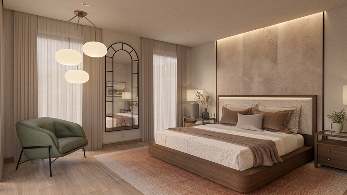 The master bedroom is designed as a private retreat with expansive views to the exterior and direct access to a private seating area on the porch. Inside, a three-sided walk-in closet offers abundant storage and a seamless layout.