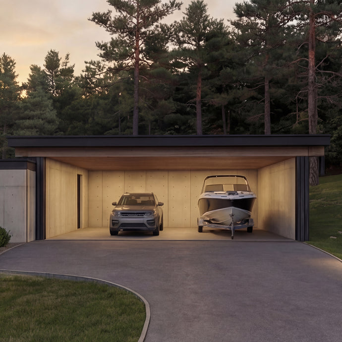 The garage is expressed as a clear, functional volume visible from the driveway. More than a service space, it acts as a transition between arrival and the interior experience, maintaining material and architectural continuity with the rest of the home.