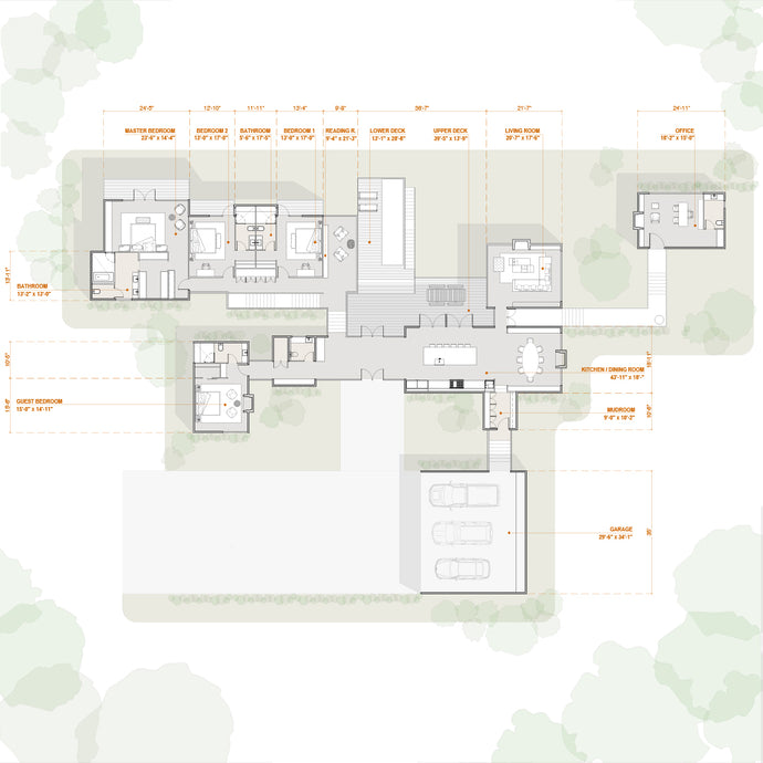 Both upper and lower decks structure the home’s relationship with the lake.
