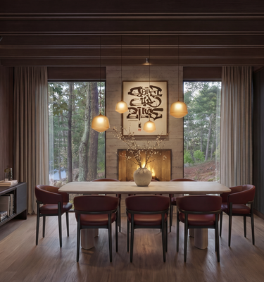 Expansive floor-to-ceiling bookshelves reflect John’s lifelong relationship with reading and writing. Designed for quiet moments and shared conversations, this room invites both reflection and connection with the surrounding landscape.