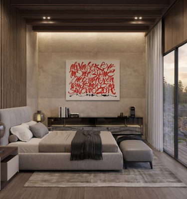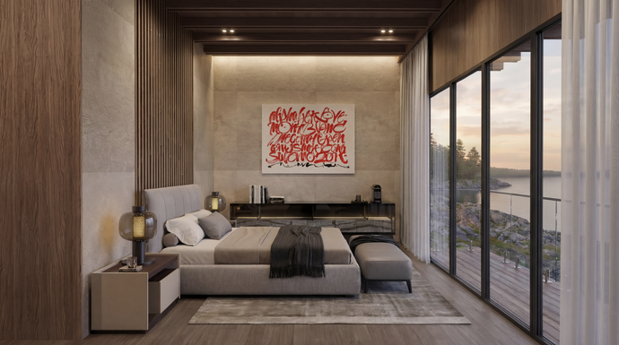 The primary bedroom is oriented directly toward the lake, offering uninterrupted views from sunrise to sunset. Conceived as a private retreat, this space allows the rhythm of the natural environment to frame the beginning and end of each day.